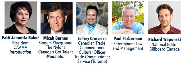 The panel features Patti Jannetta Baker, President – CAAMA (Introduction); Micah Barnes, Singers Playground, The Nylons, Canada’s Got Talent (Moderator); PANELISTS: Jeffrey Crossman, Canadian Trade Commissioner, Cultural Affairs Officer, Trade Commissioners Service, Global Affairs, Government of Canada; Paul Farberman, Entertainment Law and Management; Richard Trapunski, National Editor, Billboard Canada.